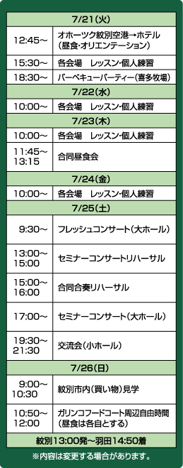 期間中のタイムスケジュール(変更の場合あり)