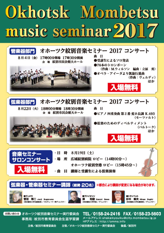管楽器部門セミナーの集大成ともいえるコンサートが8/4(金)17:30より紋別市民会館大ホールにて行われます。
