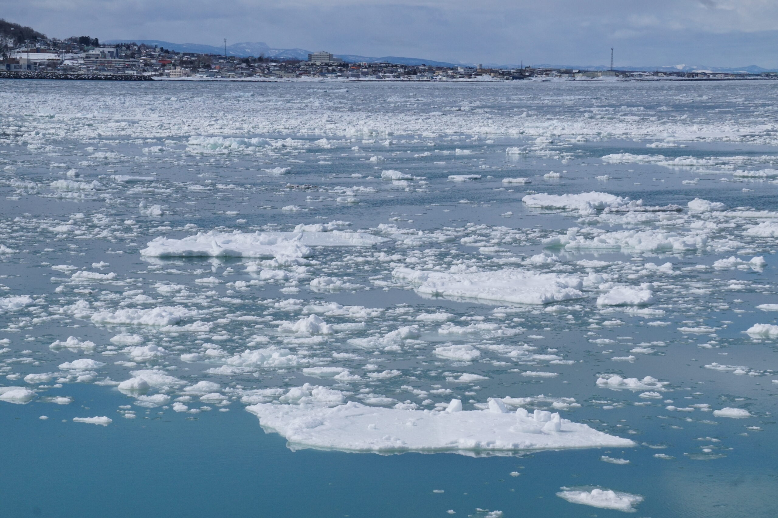 写真は現在の紋別。まだ流氷がギッシリ居ます。